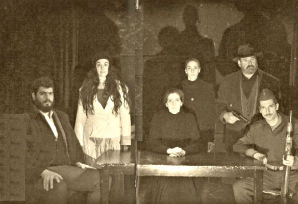 στο κατάμαυρο σκηνικό που αναπαριστά το εσωτερικό ενός φτωχικού σπιτιού, κάπου